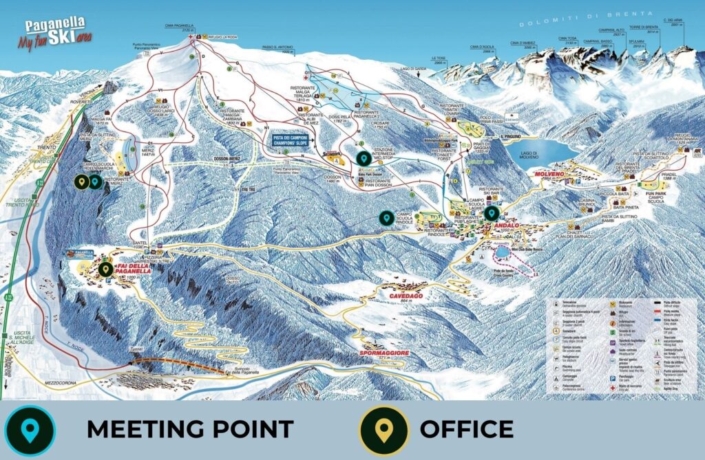 From the north, take the A22 motorway exit at San Michele all’Adige and follow the SP64 towards Andalo/Fai della Paganella. From the south, take the A22 motorway exit at Trento Nord and follow the signs for the Altopiano della Paganella.