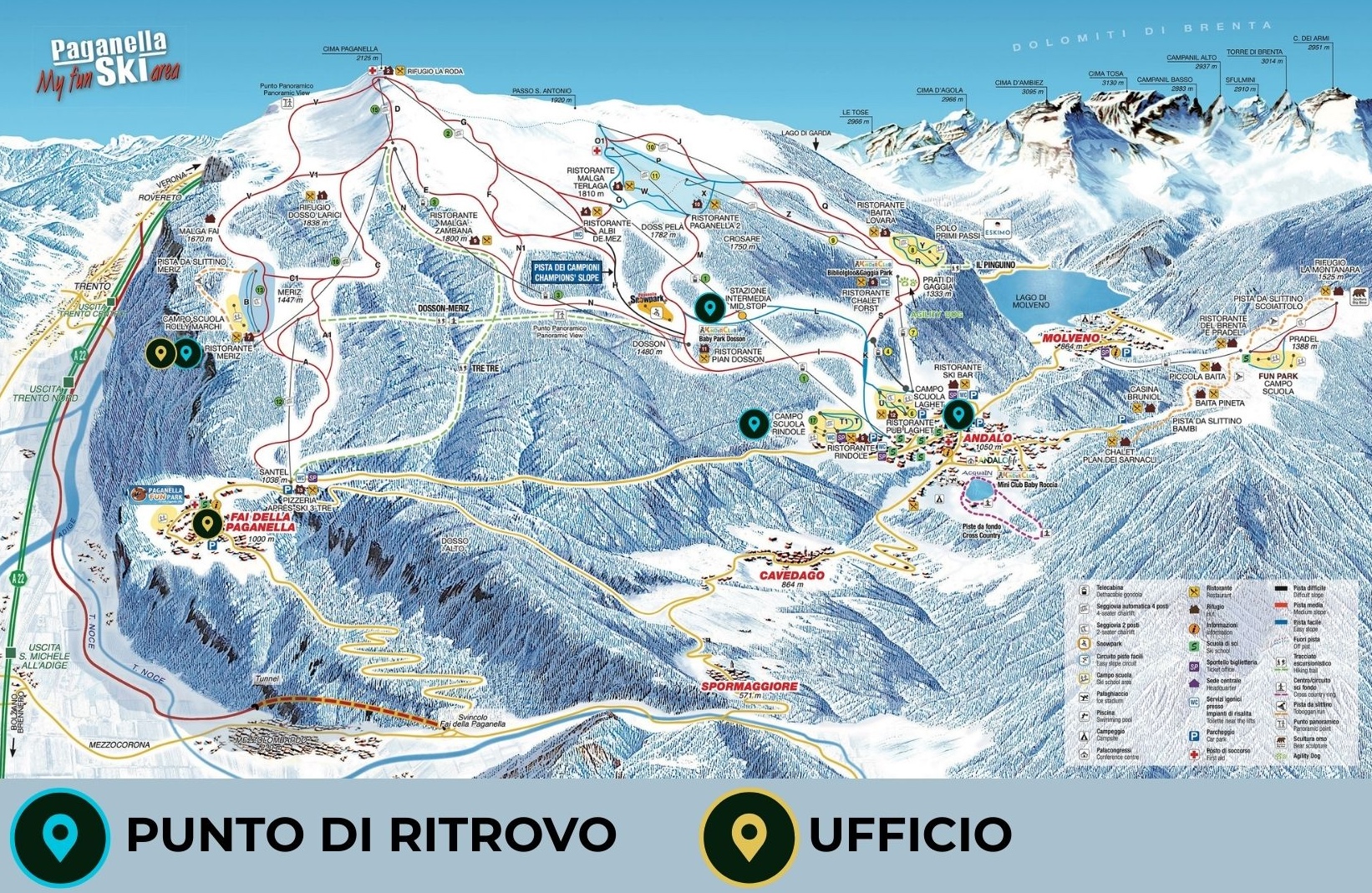ritrovo più popolari sono in località Rindole o località Laghet che dispongono di grandi aree parcheggio e di ampi campi scuola per i principianti. Per chi sa già sciare può essere più comodo fissare il punto di ritrovo al pian Dosson (all’intermedia della cabinovia Andalo – Doss Pelà), dove si trova il Family Chalet Dosson.